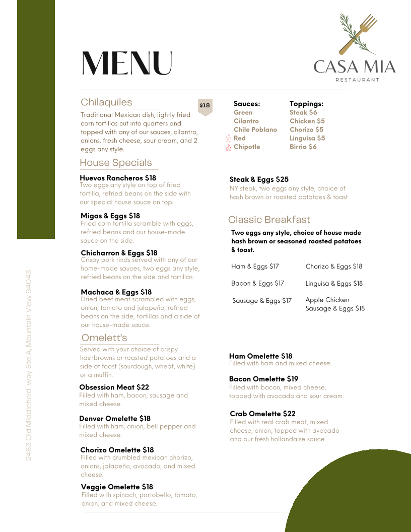 Introducing the menu at Casa Mia Restaurant (Mountain View) is a delightful experience merging Mexican and American culinary favorites. Start your morning with their signature French Toast, available in various styles like the indulgent Churro French Toast or the creamy Three Leches version. Each option is bursting with flavor and offers a sweet start to your day.